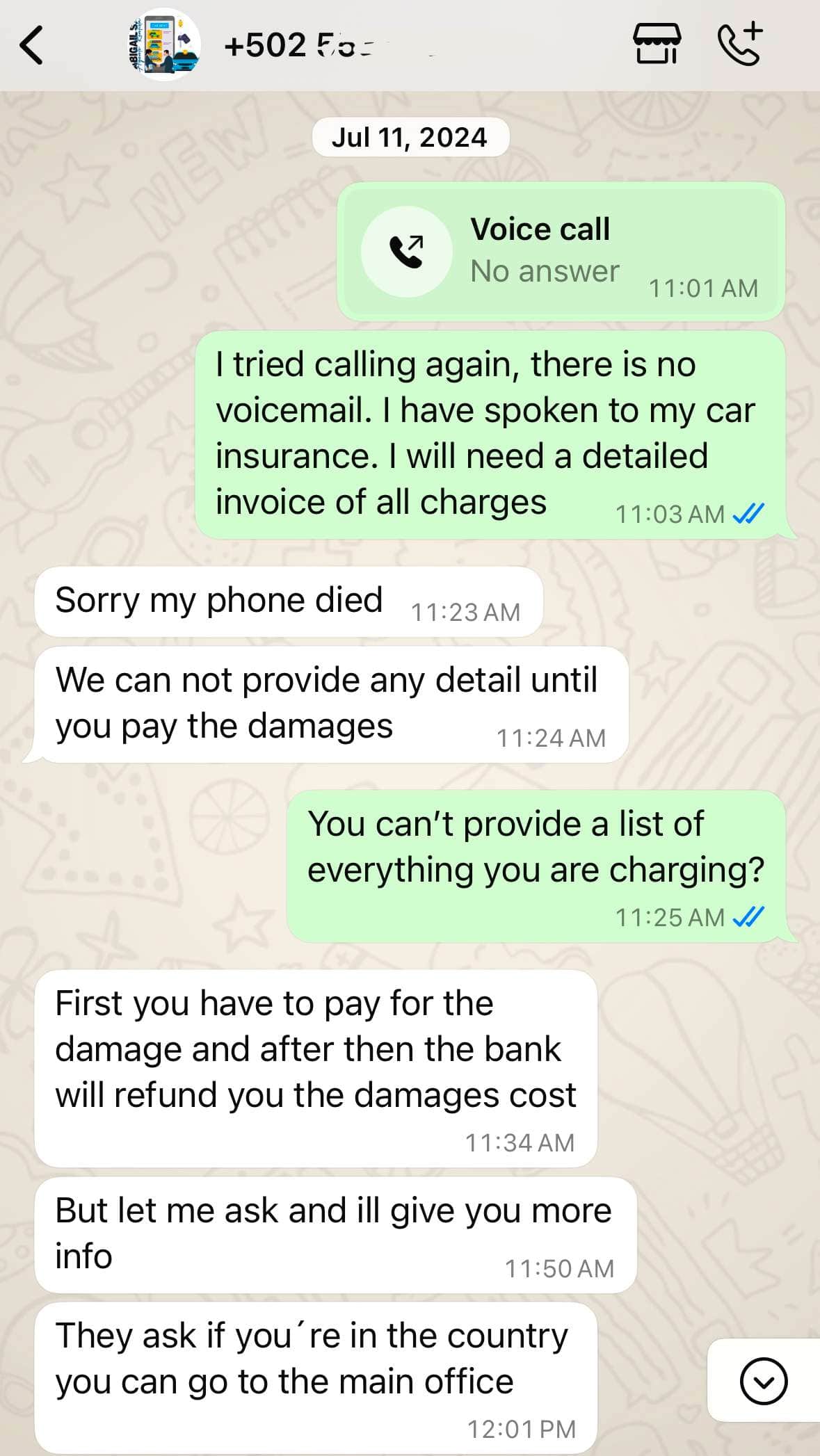 Only after the tow driver showed up did Alamo deign to call me back. I told them they needed to provide me with an itemized list of all charges for my rental insurance, and they said that was not their policy. Meanwhile they had the audacity to try to charge my card 4 separate times $1300-2100 (which were all denied by Chase) but “could not tell me” what the charges were for.